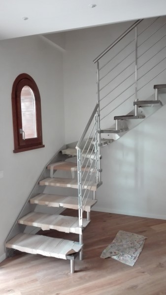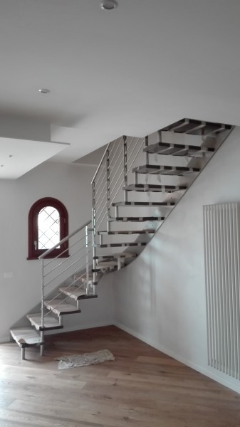 eseguita in legno massello di Faggio spess. mm.42; struttura sagomata sotto gradino di arrivo a soletta. Gradini in legno di Faggio lucidato dello spessore di mm. 40; fissaggio laterale alla struttura; frontalino di arrivo a soletta; primo gradino squadrato; lucidatura colore legno grigio cenere.