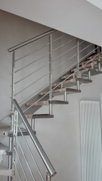 Ringhiera, solo lato interno, “F22” con montanti verticali in doppio quadro pieno in acciaio inox satinato, mm. 15×15; corrimano cilindrico in acciaio inox satinato; n.° 6 correnti tubini in acciaio inox satinato.